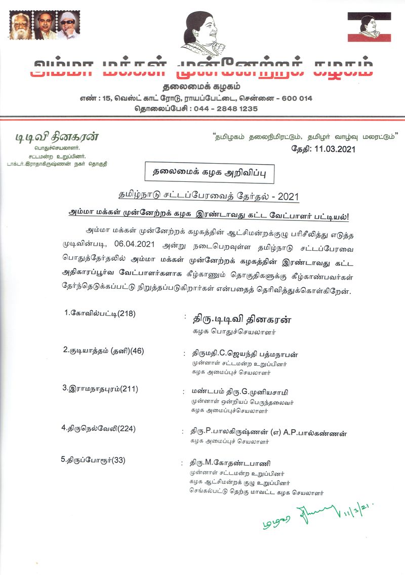 தமிழக சட்டமன்ற தேர்தல் ஏப்ரல் 6ம் தேதி நடைபெற உள்ளது. இந்த தேர்தலில் பதிவாகும் வாக்குகள் மே 2ம் தேதி எண்ணப்பட்டு முடிவுகள் வெளியாக உள்ளன. இந்நிலையில், அமமுக முதற்கட்டமாக 15 தொகுதிகளுக்கான வேட்பாளர்கள் பட்டியலை அறிவித்திருந்து. இதனையடுத்து, 2ம் கட்ட வேட்பாளர் பட்டியல் தற்போது வெளியாகியுள்ளது. இதில், அமமுக பொதுச்செயலாளர் டிடிவி.தினகரன் எங்கு போட்டியிடுவார் என்று எதிர்பார்க்கப்பட்ட நிலையில் அவர் கோவில்பட்டி தொகுதியில் அமைச்சர் கடம்பூர் ராஜூவை எதிர்த்து போட்டியிட உள்ளார். அதேபோல், அதிமுக இருந்து அமமுகவில் இணைந்த ராஜவர்மனுக்கு சாத்தூர் தொகுதி வழங்கப்பட்டுள்ளது.