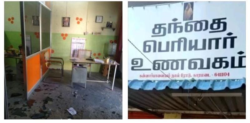 மத்தியில் பாஜக ஆட்சிக்கு வந்தது முதல் தமிழகத்தில் அண்ணா, பெரியார் கலைஞர் உள்ளிட்ட தலைவர்கள் மீது பாஜகவினரின் விமர்சனம் அதிகரித்துள்ளது. ஆங்காங்கு பெரியார் சிலைகள், அம்பேத்கர் சிலைகள் சேதப்படுத்தப்பட்டு வருகிறது. அதிலும் ஆட்சிக்கு வந்தது முதல் இதுபோன்ற நடவடிக்கைகள் அதிகரித்துள்ளது. இந்நிலையில் கோவை மாவட்டம் காரமடை அடுத்துள்ள கண்ணார் பாளையம் பகுதியில் 4 ரோடு பகுதியில் பிரபாகரன் என்பவர் தந்தை பெரியாரின் பெயரில் உணவகம் ஒன்றை கேட்டு திறந்தார்.