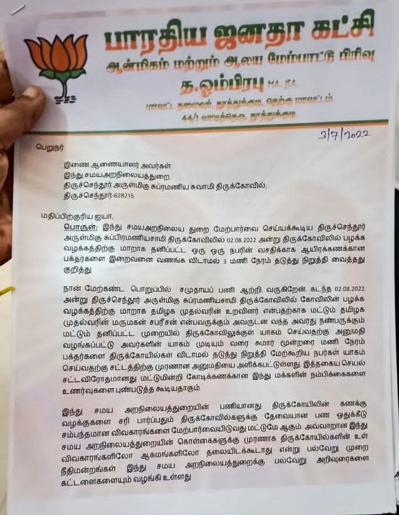 நான் மேற்கண்ட பொறுப்பில் சமுதாயப் பணி ஆற்றி வருகிறேன், கடந்த 2-8- 2022 அன்று திருச்செந்தூர் முருகன் கோவிலில் கோவிலின் பழக்க வழக்கத்திற்கு மாறாக தமிழக முதல்வரின் உறவினர் என்பதற்காக மட்டும், தமிழக முதல்வரின் மருமகன் சபரீசன் என்பவருக்கும் அவருடன் வந்த அவரது நண்பருக்கும் மட்டும் தனிப்பட்ட முறையில் திருக்கோயிலுக்குள் யாகம் செய்வதற்கு அனுமதி வழங்கப்பட்டுள்ளது.