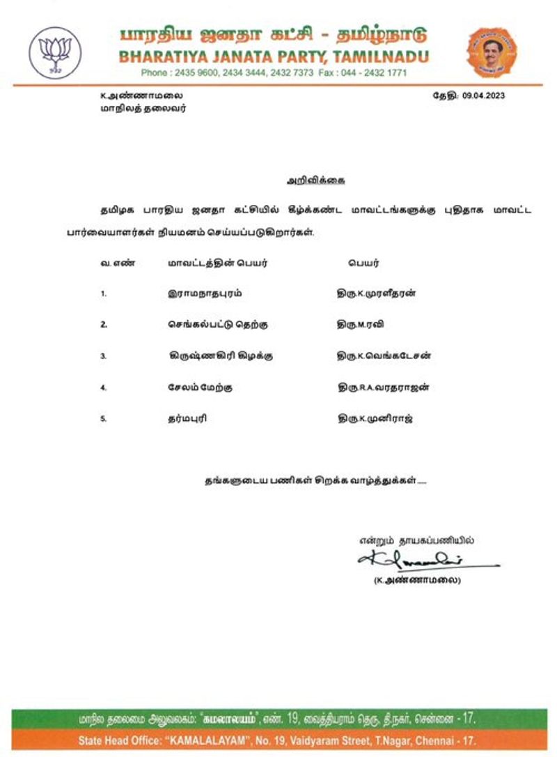 * தருமபுரி- கே.முனிராஜ் ஆகியோர் நியமித்து தங்களுடைய பணிகள் சிறக்க வாழ்த்துக்கள் என அண்ணாமலை கூறியுள்ளார்.