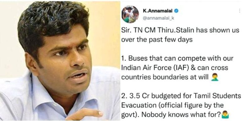 உக்ரைனில் சிக்கியுள்ள இந்தியர்களை மீட்க மத்திய அரசு பல்வேறு நடவடிக்கைகளை எடுத்து வருகிறது. இதுவரை 17 ஆயிரத்துற்கும் மேற்பட்ட இந்தியர்களை ஆப்ரேஷன் கங்கா என்ற திட்டம் மூலம் மீட்கப்பட்டுள்ளனர். இந்த நிலையில் மாணவர்களை மீட்பதில் மத்திய அரசு பாகுபாடு பார்ப்பதாக கூறி தமிழக அரசு குற்றம்சாட்டியிருந்தது. இதனையடுத்து தமிழக மாணவர்களை விரைவாக மீட்க திமுக நாடாளுமன்ற உறுப்பினர்களை கொண்ட குழுவானது அமைக்கப்பட்டது. மேலும் தமிழக மாணவர்கள் மீட்கும் நடவடிக்கைக்கு 3.5 கோடி ரூபாயும் தமிழக அரசு ஒதுக்கீடும் செய்தது. இதற்கு பாஜகவினர் கடும் எதிர்ப்பு தெரிவித்து வருகின்றனர். தங்களது எல்லையை தமிழக அரசு புரிந்து கொண்டு செயல்பட வேண்டும் என கூறி வருகின்றனர். இந்த நிலையில் தமிழக பாஜக தலைவர் அண்ணாமலை வெளியிட்டுள்ள டுவிட்டர் பதிவில் கடந்த சில நாட்களாக இந்திய விமானப்படையுடன் போட்டியிடக்கூடிய பேருந்துகளும், தங்கள் விருப்பப்படி நாடுகளின் எல்லையை கடக்க முடியும் என்பதையும் தமிழக முதல்வர் ஸ்டாலின் காட்டியுள்ளதாக கிண்டல் அடித்துள்ளார். மேலும் உக்ரைனில் சிக்கியுள்ள மாணவர்களை மீட்க தமிழக அரசு 3.5 கோடி ரூபாய் ஒதுக்கீடு செய்யப்பட்டுள்ளதாக தெரிவித்த அவர், எதற்காக இந்த நிதி ஒதுக்கீடு செய்யப்பட்டுள்ளது என்றும் இது யாருக்கு என தெரியவில்லையென கூறியுள்ளார்.