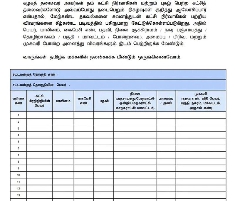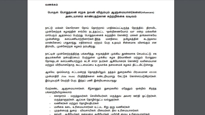 இந்த நிலையில் திடீரென திமுக தலைமையிடம் இருந்து மாவட்டச் செயலாளர்களுக்கு அனுப்பி வைக்கப்பட்டுள்ள சுற்றறிக்கை வெளியாகியுள்ளது. அதிலும் உள்ளூரில் பிரபலமாக இருக்கும் கட்சி உறுப்பினர்களின் விவரங்களை கட்சித் தலைமைக்கு அனுப்பி வைக்க வேண்டும் என்று கூறப்பட்டுள்ளது. குறிப்பாக குறைந்தது 20 பேரிடமாவது தாக்கத்தை ஏற்படுத்தக்கூடிய நபராக அந்த பிரபலமான திமுக பிரமுகர் இருக்க வேண்டும் என்பது உள்ளிட்ட பல்வேறு விதிமுறைகள் அதில் சுட்டிக்காட்டப்பட்டுள்ளன.