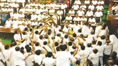 இதில் ஏற்பட்ட அமளியில் சட்டசபை போர்க்களமானது. திமுக எம்எல்ஏக்கள் சபாநாயகரை கேரோ செய்து அவரது இருக்கையில் அமர்ந்து அமளியை ஏற்படுத்தினர்.போலீசார் சட்டசபைக்குள் வரவழைக்கப்பட்டு எதிர்கட்சி தலைவர் ஸ்டாலின் உள்ளிட்டோர் வெளியேற்றபட்டனர்.