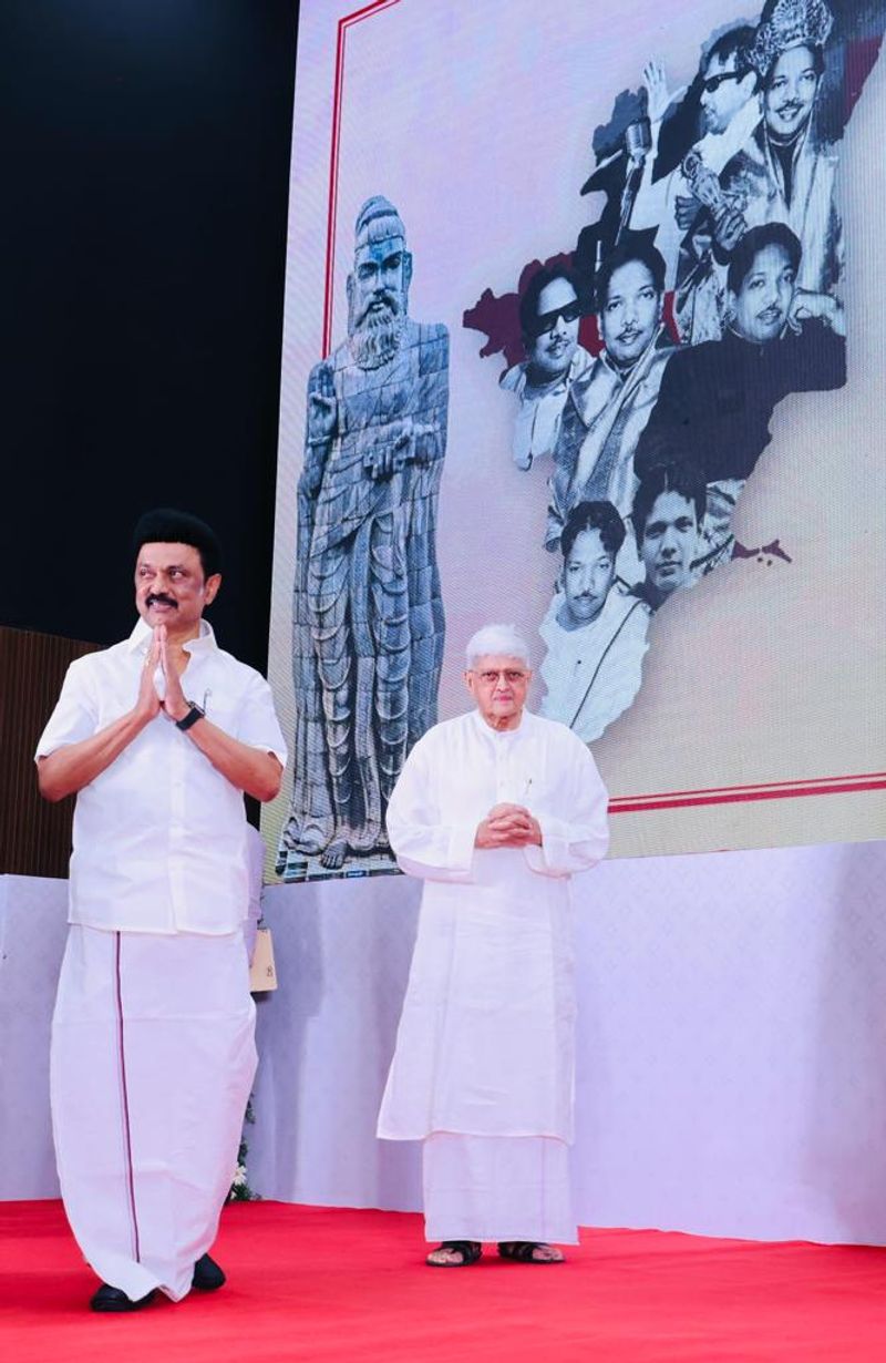 தொடர்ந்து பேசிய அவர், கருணாநிதி பெருமையை பேசிக்கொண்டே இருக்கலாம், அவரால் நாங்கள் வளர்ந்தோம் என்பதே பெருமை, அவருக்கு நூற்றாண்டு விழா எடுப்பது பெருமை, அதைவிட பெருமை நூற்றாண்டு விழா எடுக்கும் நேரத்தில் ஸ்டாலினை முதலமைச்சராக பொது மக்கள் அமர வைத்தார்களே அது பெருமை, வேற எவனையாவது உட்கார வைத்திருந்தால் சின்ன விளம்பரம் கூட கொடுத்திருக்க மாட்டார்கள். காலம் எந்த நேரத்தில் யாரை வைத்தால் என்ன நடக்கும் என முடிவு செய்துள்ளதாக தெரிவித்தார். இதனை தொடர்ந்து பேசிய முன்னாள் ஆளுநர் கோபால கிருஷ்ண காந்தி, முதலமைச்சர் ஸ்டாலின் பல யோசனைகளை கேட்டு என்னை போல அரசியலில் ஆனா ஆவன்னா கூட தெரியாத என்னை இந்த விழாவுக்கு அழைத்துள்ளதாக கருதுகிறேன்.