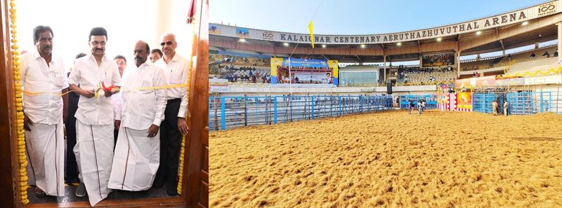 மதுரை மாவட்டம், அலங்காநல்லூர், கீழக்கரை கிராமத்தில் 66.80 ஏக்கர் நிலப்பரப்பில், 77,683 சதுரஅடி பரப்பளவில் 62.78 கோடி ரூபாய் செலவில் உலகத்தரத்துடன் கட்டப்பட்டுள்ள கலைஞர் நூற்றாண்டு ஏறுதழுவுதல் அரங்கத்தை திறந்து வைத்து, ஏறுதழுவுதல் போட்டிகளை தொடங்கி வைத்து முதலமைச்சர் ஸ்டாலின் பார்வையிட்டார். இதனை தொடர்ந்து நிகழ்சியில் பேசிய அவர், தமிழர் பண்பாட்டு விளையாட்டான ஏறுதழுவுதலுக்கு சங்கம் வளர்த்த மதுரையில் இந்த மாபெரும் அரங்கம் நம்முடைய திராவிட முன்னேற்றக் கழக அரசால் கட்டி எழுப்பப்பட்டிருக்கிறது.