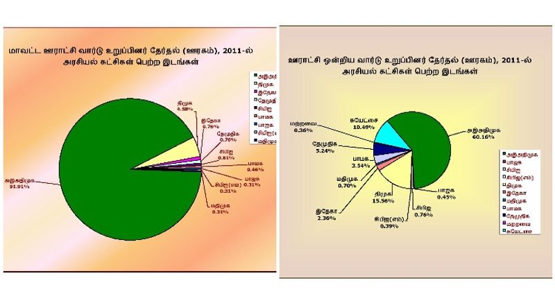 ஆனால், 2011 உள்ளாட்சித் தேர்தலில் ஊரகப் பகுதிகளில் கிடைத்த முடிவுகள் தற்போது மாறுபட்டுள்ளது. அப்போது எல்லா எதிர்க்கட்சிகளும் தனித்துதான் போட்டியிட்டன. அந்தத் தேர்தலில் அதிமுக ஊரகப் பகுதிகளில் மொத்தமாக வெற்றியை அறுவடை செய்தது. திமுக குறைவான இடங்களிலேயே வெற்றி பெற்றுள்ளது. கடந்த 2011-ம் ஆண்டு மாவட்ட கவுன்சிலர் தேர்தலில் அதிமுக 91.91 சதவீத பதவிகளைக் கைப்பற்றியது. திமுக 4.58 பதவிகளையும் கைப்பற்றியது. இதேபோல ஒன்றிய கவுன்சிலர் தேர்தலில் அதிமுக 60.16 சதவீத இடங்களைக் கைப்பற்றியது. திமுக 15.56 சதவீத இடங்களை மட்டுமே வென்றது.