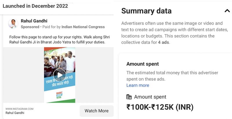 இருப்பினும், இவை அனைத்தும் திடீரென்று மற்றும் தானாகவே நடக்கவில்லை, இது ஃபேஸ்புக்கின் விளம்பர செயல்முறை. இதில் மக்களைச் சென்றடைய ஒவ்வொரு பதிவுக்கும் தினமும் லட்சக்கணக்கான ரூபாய்களை காங்கிரஸ் செலவிடுகிறது. ஃபேஸ்புக்கின் விளம்பர தரவுகளைப் பார்த்தபோது, ஆச்சரியமான தகவல்கள் வெளியாகின. ராகுல் காந்தியை சமூக வலைதளங்களில் பிரபலப்படுத்தவும், மக்களை சென்றடையவும், ஒவ்வொரு பதவிக்கும் காங்கிரஸ் லட்சக்கணக்கான ரூபாய் செலவு செய்து வருகிறது. ஃபேஸ்புக் விளம்பர நூலகத்தில் இருந்து கிடைத்த தகவலின்படி, ராகுல் காந்தியின் முகநூல் பக்கத்தில் விளம்பரங்களுக்காக காங்கிரஸ் இதுவரை பல லட்சங்களை செலவு செய்துள்ளது. இந்தச் செலவுகளில் பெரும்பாலானவை பாரத் ஜோடோ யாத்ராவிற்கு இடையே செய்யப்பட்டவை என்பது குறிப்பிடத்தக்கது.