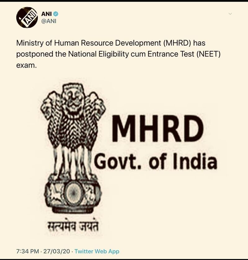 கொரொனா வைரஸ் அச்சுறுத்தல் காரணமாக மே மாதம் 3ம் தேதி நடக்க இருந்த தேர்வு ரத்து செய்யப்படுவதாக மத்திய மனித வளமேம்பாட்டு அமைச்சகம் தெரிவித்துள்ளது.