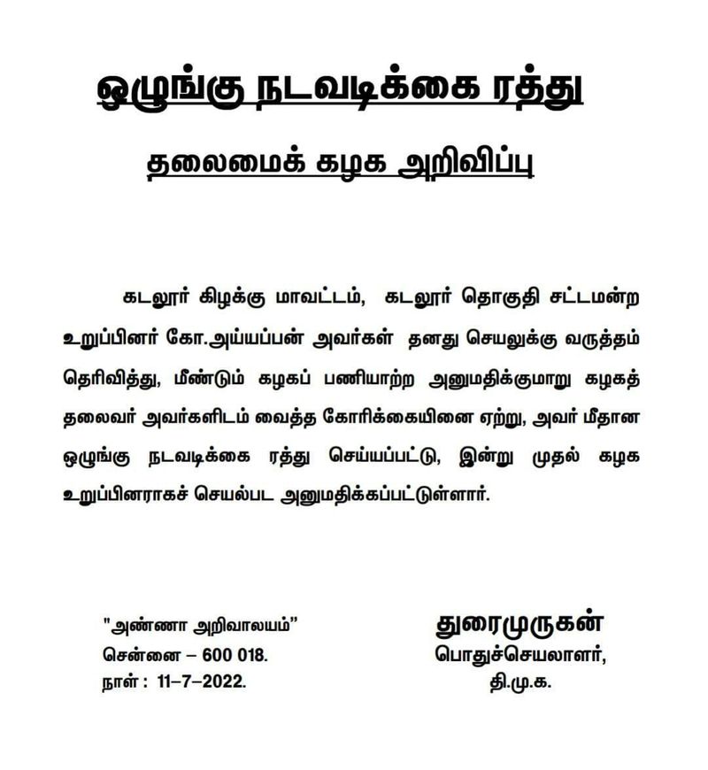 தற்பொழுது சஸ்பெண்ட் நடவடிக்கை கைவிடப்பட்டு மீண்டும் அவர் திமுகவில் பணியாற்ற அனுமதிக்கப்படுவதாக கட்சித் தலைமை அறிவித்துள்ளது.கடலூர் தொகுதி திமுக எம்.எல்.ஏ அய்யப்பன் மீதான ஒழுங்கு நடவடிக்கை ரத்து செய்யப்படுவதாக கழக பொதுச்செயலாளர் துரைமுருகன் அறிவித்துள்ளது.