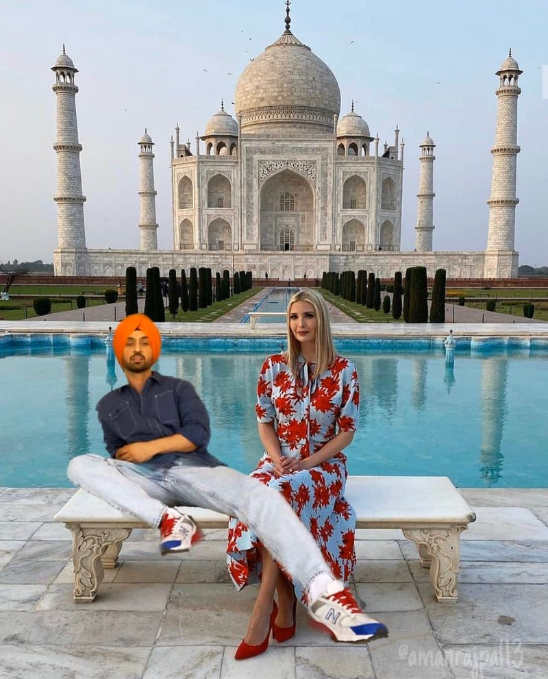 அமெரிக்க அதிபர் டொனால்ட் டிரம்ப் 2 நாள் அரசுமுறைப் பயணமாக இந்தியா வந்திருந்தார். அவருடன் மெலானியா டிரம்ப், மகள் இவான்கா டிரம்ப், மருமகன் ஜேரட் குஷ்னர் ஆகியோரும் வந்திருந்தார்கள்.இந்தியப் பிரதமர் நரேந்திர மோடியை சந்தித்துவிட்டு ஆக்ராவில் உள்ள தாஜ்மஹாலை டிரம்ப் குடும்பம் ரசித்து பார்த்து திகைத்துப்போனது.டிரம்பின் மகள் இவான்கா டிரம்ப், கணவர் ஜேரட் குஷ்னர் உடன் தாஜ் மஹால் முன் புகைப்படம் எடுத்து மகிழ்ந்தார். மேலும், இந்த புகைப்படங்களை தன்னுடைய சமூக ஊடகப் பக்கங்களிலும் வெளியிட்டு வருகிறார்.பிரபல இந்திய நடிகரும், பாடகருமான டில்ஜித் தோசஞ் இவான்காவின் புகைப்படத்தை மார்ப்பிங் செய்து தன்னையும் அதில் இணைத்து, பார்ப்பதற்கு இவான்கா அருகில் டில்ஜித் தோசஞ் அமர்ந்திருப்பது போன்று வெளியிட்டிருக்கிறார்.