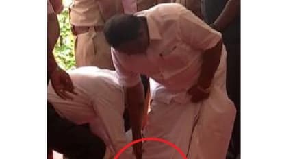 படத்துக்கு மரியாதை செலுத்தி விட்டு அமைச்சர் திண்டுக்கல் சீனிவாசன் காலணி அணியும்போது, அவரது உதவியாளர் கீழே குணிந்து அவரது காலணியை அணிவித்து விட்ட காட்சி தற்போது சமூக வலைத்தளத்தில் வேகமாக பரவி வருகிறது.