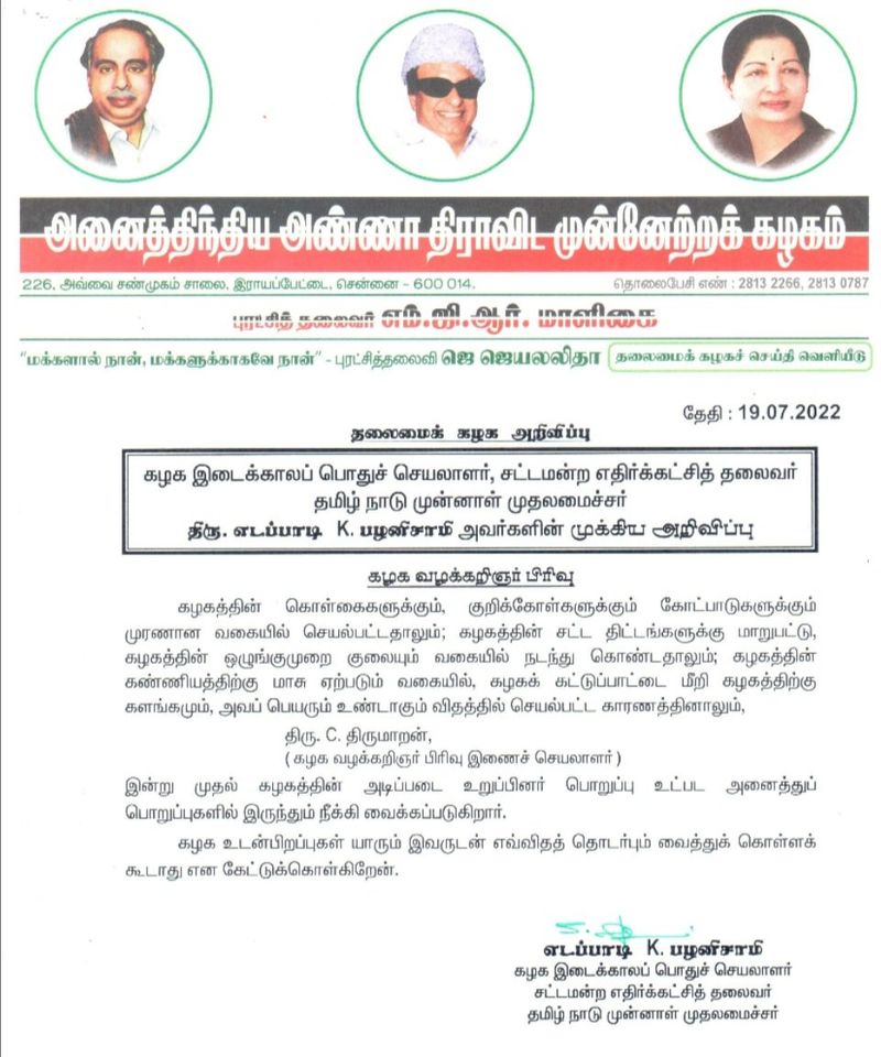 இன்று முதல் கழகத்தின் அடிப்படை உறுப்பினர் பொறுப்பு உட்பட அனைத்துப் பொறுப்புகளில் இருந்தும் நீக்கி வைக்கப்படுகிறார். கழக உடன்பிறப்புகள் யாரும் இவருடன் எவ்விதத் தொடர்பும் வைத்துக் கொள்ளக்கூடாது என கேட்டுக்கொள்கிறேன் என தெரிவித்துள்ளார்.