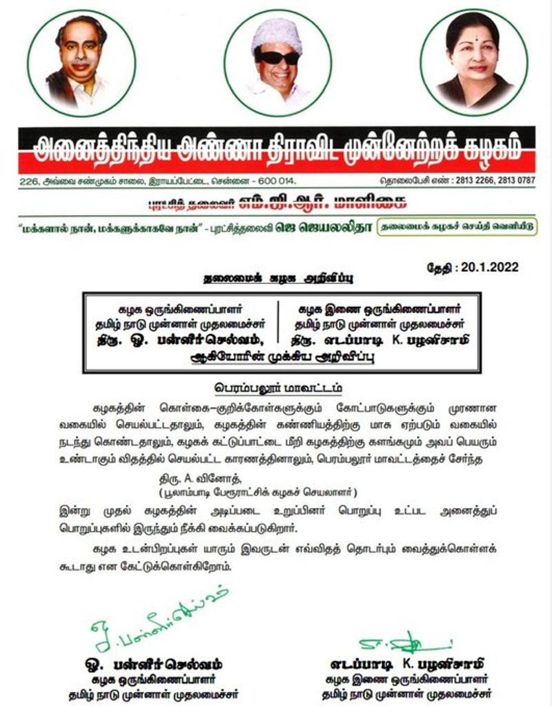 இதுதொடர்பாக அதிமுக ஒருங்கிணைப்பாளர் ஓ.பன்னீர்செல்வம், இணை ஒருங்கிணைப்பாளர் எடப்பாடி பழனிசாமி வெளியிட்டுள்ள அறிக்கையில்;- கழகத்தின் கொள்கை குறிக்கோள்களுக்கும் கோட்பாடுகளுக்கும் முரணான வகையில் செயல்பட்டதாலும் கழகத்தின் கண்ணியத்திற்கு மாசு ஏற்படும் வகையில் நடந்து கொண்டதாலும் கழகக் கட்டுப்பாட்டை மீறி கழகத்திற்கு களங்கமும் அவப் பெயரும் உண்டாகும் விதத்தில் செயல்பட்ட காரணத்தினாலும் பெரம்பலூர் மாவட்டத்தைச் சேர்ந்த A.வினோத் (பூலாம்பாடி பேரூராட்சிக் கழக செயலாளர்) இன்று முதல் கழகத்தின் அடிப்படை உறுப்பினர் பொறுப்பு உட்பட அனைத்துப் பொறுப்புகளிலும் இருந்தும் நீக்கி வைக்கப்படுகிறார்.