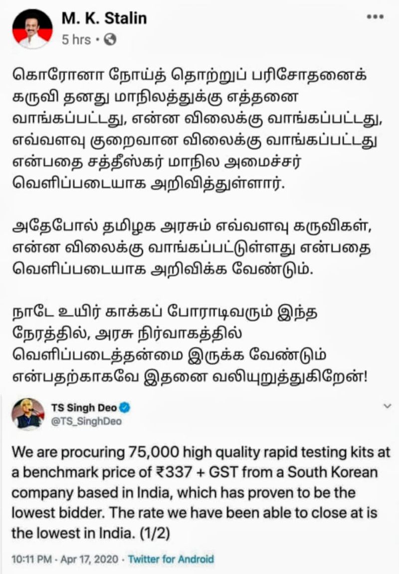 தென் கொரியாவுடன் தொடர்ந்து பொருட்கள் கொள்முதல் செய்வோம் , எங்களுக்கு உதவிய தென் கொரிய தூதருக்கு நன்றி என அவர் தெரிவித்துள்ளார் . இந்நிலையில் சத்தீஸ்கர் மாநில எம்எல்ஏவின் டுவிட்டரை மேற்கோள்காட்டியுள்ள திமுக தலைவர் மு.க ஸ்டாலின், கொரோனா நோய்த்தொற்று பரிசோதனை கருவி தனது மாநிலத்திற்கு எத்தனை வாங்கப்பட்டது என்ன விலைக்கு வாங்கப்பட்டது எவ்வளவு குறைவான விலைக்கு வாங்கப்பட்டது என்பதை சத்தீஷ்கர் மாநில முதலமைச்சர் வெளிப்படையாக அறிவித்துள்ளார் . அதே போல் தமிழக அரசும் எவ்வளவு கருவிகளை என்ன விலைக்கு வாங்கப்பட்டது என்பதை வெளிப்படையாக அறிவிக்க வேண்டும் . நாடே உயிர் காக்க போராடி வரும் இந்த நேரத்தில் அரசு நிர்வாகத்தில் வெளிப்படைத் தன்மை இருக்க வேண்டும் என்பதற்காகவே இதனை வலியுறுத்துகிறேன் என அரசுக்குஸ்டாலின் வினா எழுப்பியுள்ளார் .