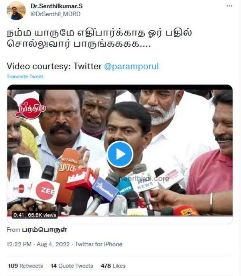 இந்நிலையில் இது தொடர்பாக தனது ட்விட்டர் பக்கத்தில் கருத்து பதிவிட்டுள்ள தருமபுரி நாடாளுமன்ற உறுப்பினர் செந்தில்குமார், சீமானின் கேள்வியைக் கிண்டலடித்து தனது ட்விட்டரில் பதிவிட்டுள்ளார். " நம்ம யாருமே எதிர்பார்க்காத ஒரு பதில் சொல்லுவார் பாருங்கககக" என்றும் அவர் பதிவிட்டுள்ளார். இதற்கு பல திமுகவினர் கமெண்ட் செய்து வருகின்றனர்.