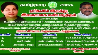 “மாண்புமிகு தமிழ்நாடு முதலமைச்சர் அவர்களின் ஆணைக்கிணங்க விவசாயிகள் மற்றும் பொதுமக்கள் கீழ்க்காணுமாறு இலவசமாக ஏரிகளில் இர்நுது மண் எடுத்துப் பயன் அடைவீர்.