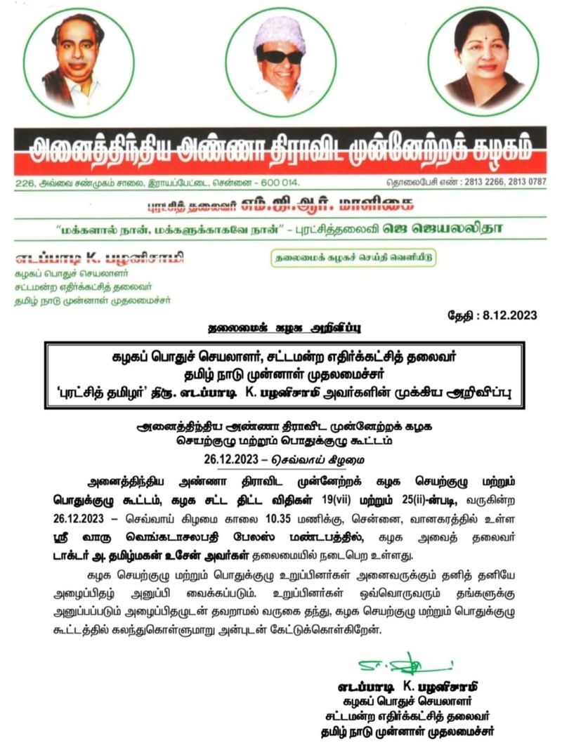 இது தொடர்பாக அதிமுக பொதுச்செயலாளர் எடப்பாடி பழனிச்சாமி வெளியிட்டுள்ள அறிவிப்பில், அனைத்திந்திய அண்ணா திராவிட முன்னேற்றக் கழக செயற்குழு மற்றும் பொதுக்குழு கூட்டம், கழக சட்ட திட்ட விதிகள் 19(vii) மற்றும் 25(ii)-ன்படி, வருகின்ற 26.12.2023 செவ்வாய் கிழமை காலை 10.35 மணிக்கு, சென்னை, வானகரத்தில் உள்ள ஸ்ரீ வாரு வெங்கடாசலபதி பேலஸ் மண்டபத்தில், கழக அவைத் தலைவர் டாக்டர் அ. தமிழ்மகன் உசேன் அவர்கள் தலைமையில் நடைபெற உள்ளது.