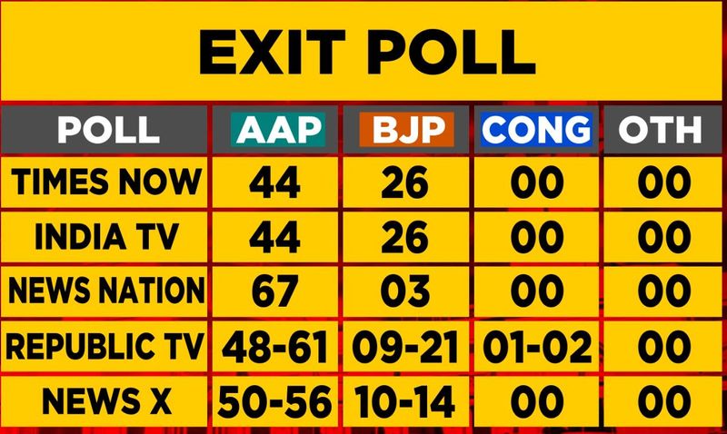இந்நிலையில், மாலை 6 மணிக்குப் பிறகு தேர்தலுக்குப் பிந்தைய கருத்துகணிப்பு முடிவுகள் வெளியாயின. எல்லாக் கருத்துக்கணிப்புகளிலும் ஆம் ஆத்மி கட்சியே டெல்லியைத் தக்கவைத்துக்கொள்ளும் எனத் தெரிவிக்கப்பட்டுள்ளது. டைம்ஸ் நவ் கருத்துகணிப்பில் மொத்தம் உள்ள 70 தொகுதிகளில் ஆம் ஆத்மி 44 தொகுதிகளையும் பாஜக 26 தொகுதிகளையும் கைப்பற்றும் எனத் தெரிவிக்கப்பட்டுள்ளது. நியூஸ் எக்ஸ் கருத்துக்கணிப்பில் ஆம் ஆத்மி 53 முதல் 57 இடங்களையும், பாஜக 11 முதல் 17 இடங்களையும் காங்கிரஸ் 0 முதல் 2 இடங்களையும் வெல்லும் எனக் கூறப்பட்டுள்ளது.