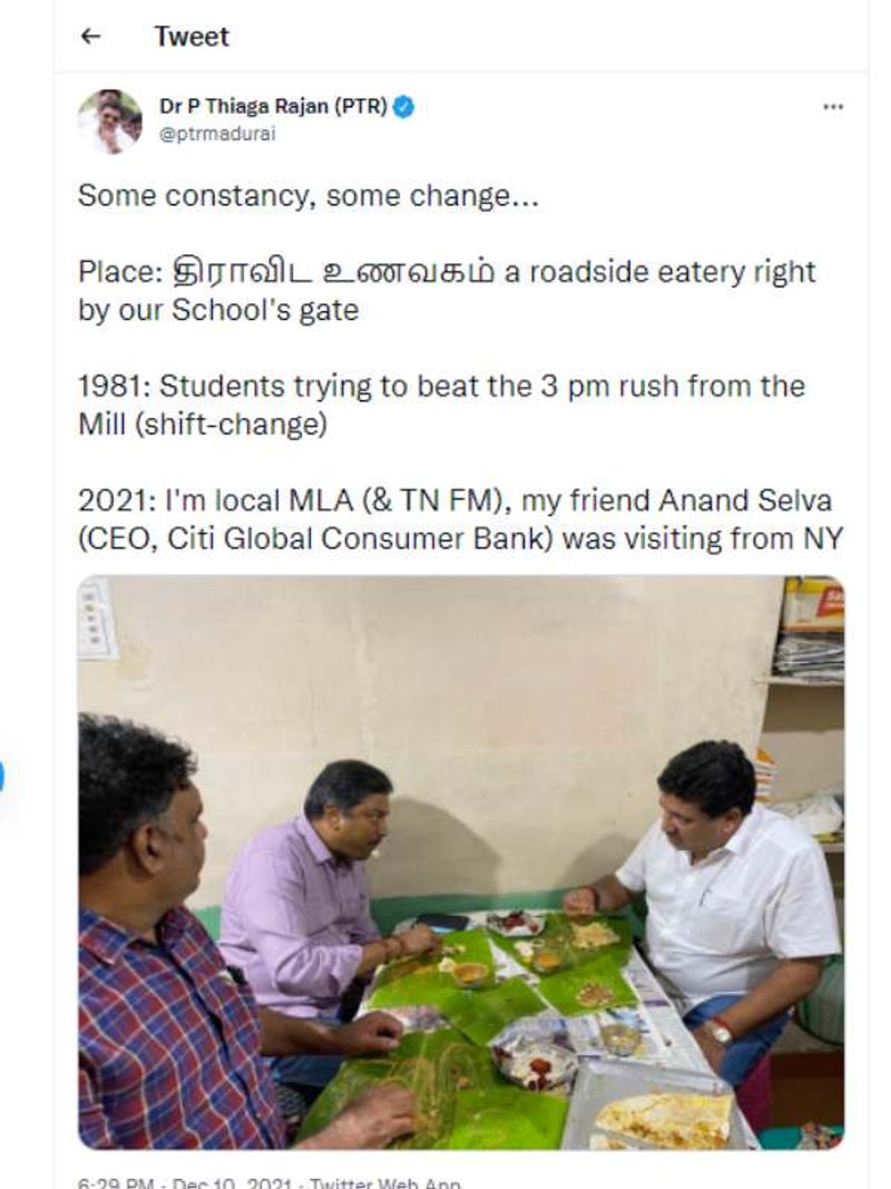 தற்போது நான் எவ்வளவும் பெரிய பதவில் இருந்தாலும் பழசை எப்போதும் மறக்கமாட்டேன் எனும் வகையில் நிதித்துறை அமைச்சர் பிடிஆர் பழனிவேல் தியாகராஜன் பதிவிட்ட ஒரு டீவிட் நெட்டிசன்களால் வரவேற்கப்பட்டுள்ளது.