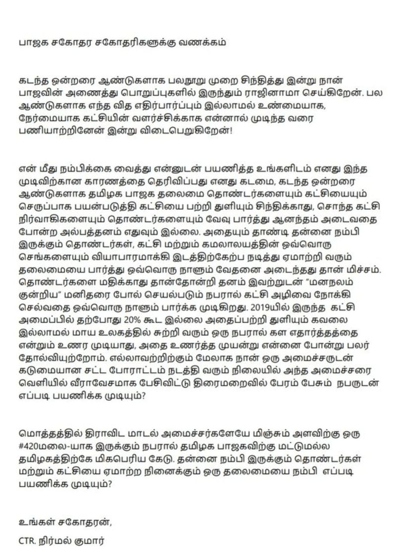 நிர்மல்குமார் இதுகுறித்து வெளியிட்டுள்ள அறிக்கையில், பாஜக சகோதர சகோதரிகளுக்கு வணக்கம் கடந்த ஒன்றரை ஆண்டுகளாக பலநூறு முறை சிந்தித்து இன்று நான் பாஜவின் அணைத்து பொறுப்புகளில் இருந்தும் ராஜினாமா செய்கிறேன். பல ஆண்டுகளாக எந்த வித எதிர்பார்ப்பும் இல்லாமல் உண்மையாக, நேர்மையாக கட்சியின் வளர்ச்சிக்காக என்னால் முடிந்த வரை பணியாற்றினேன் இன்று விடைபெறுகிறேன்.