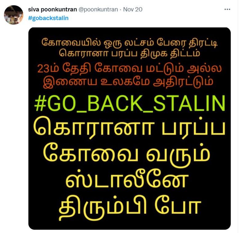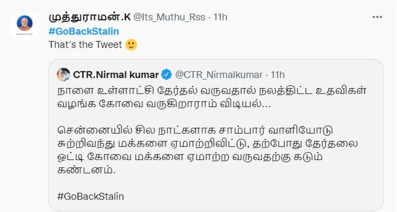 இப்படித்தான் எதிர்ப்பு வாசகங்கள் இருக்க வேண்டும் என்று இல்லை…இஷ்டம் போல நேற்றிரவு முதலே #GoBackStalin கருத்துகளை கலந்து கட்டி அடித்து இணையத்தை அதகளமாக்கி வருகின்றனர். கோவை வருகிறாரா? எதற்கு? என்று தெரியாதது போல் கேட்டு காமெடி செய்யும் டுவிட்டர் பதிவுகளும் அதிகம் வலம் வர ஆரம்பித்து இருக்கின்றன.