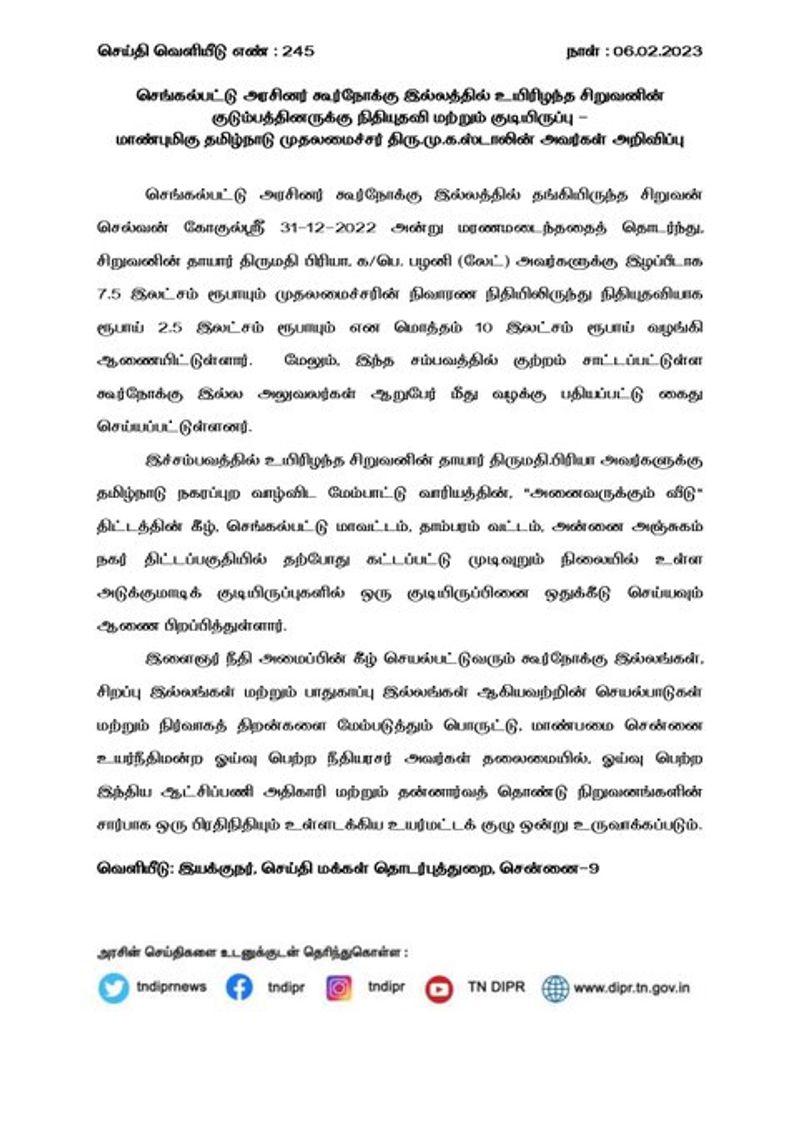 இச்சம்பவத்தில் உயிரிழந்த சிறுவனின் தாயார் பிரியா அவர்களுக்கு தமிழ்நாடு நகரப்புற வாழ்விட மேம்பாட்டு வாரியத்தின், “அனைவருக்கும் வீடு” திட்டத்தின் கீழ், செங்கல்பட்டு மாவட்டம், தாம்பரம் வட்டம், அன்னை அஞ்சுகம் நகர் திட்டப்பகுதியில் தற்போது கட்டப்பட்டு முடிவுறும் நிலையில் உள்ள அடுக்குமாடிக் குடியிருப்புகளில் ஒரு குடியிருப்பினை ஒதுக்கீடு செய்யவும் ஆணை பிறப்பித்துள்ளார்.