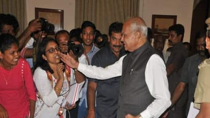 செய்தியாளர் சந்திப்பு முடிந்த பின், பல்வேறு கேள்விகளை எழுப்பிய பெண் பத்திரிக்கையாளரை லட்சுமி சுப்ரமணியன் என்பவரை பாராட்டும் விதமாக அவரது கன்னத்தில் ஆளுநர் செல்லமாக தடவினார்.