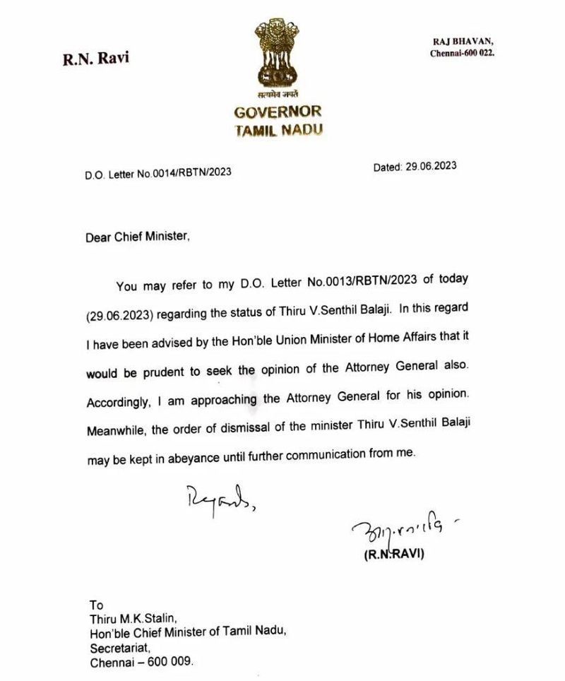 அதில், செந்தில் பாலாஜி பதவி நீக்கம் தொடர்பாக மத்திய உள்துறை அமைச்சர் அமித்ஷா எனக்கு அறிவுறுத்தியுள்ளார். தலைமை வழக்கறிஞரிடம் கருத்தையும் கேட்பது சரியானதாக இருக்கும் என்பதால் அவரை அணுகி கருத்து கேட்க உள்ளேன். ஆகையால், அமைச்சர் செந்தில் பாலாஜியின் பதவி நீக்க உத்தரவு, என்னிடம் இருந்து அடுத்த அறிவிப்பு வரும் வரை நிறுத்தி வைக்கப்படுகிறது என கடிதத்தில் குறிப்பிட்டுள்ளார்.