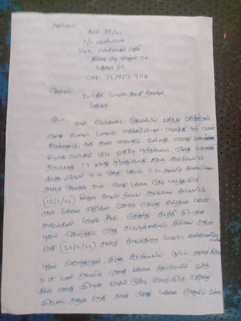 மேலும், வழக்கு எதுவும் பதிவு செய்ய வேண்டாம் என்றும் வழக்குப் பதிவு செய்தால் தன்னுடைய மகளின் விவரம் பத்திரிக்கையில் வந்துவிடும் என கருதி மட்டும் மனு ரசீது மட்டும் போட்டு தருமாறு தாய் கேட்டுள்ளார். அதன்படியே போலீசார் ரசீது கொடுக்காமல் இந்த வழக்கை விசாரித்து வந்துள்ளனர். வழக்கின் விசாரணையில் காணாமல் போன பெண் அதே கிராமத்தைச் சேர்ந்த சுல்தான் என்பவரின் மகன் நாகூர் ஹனிபா என்பவரை காதலித்ததாகவும் அவருடன் சென்றிருப்பது தெரியவந்தது.