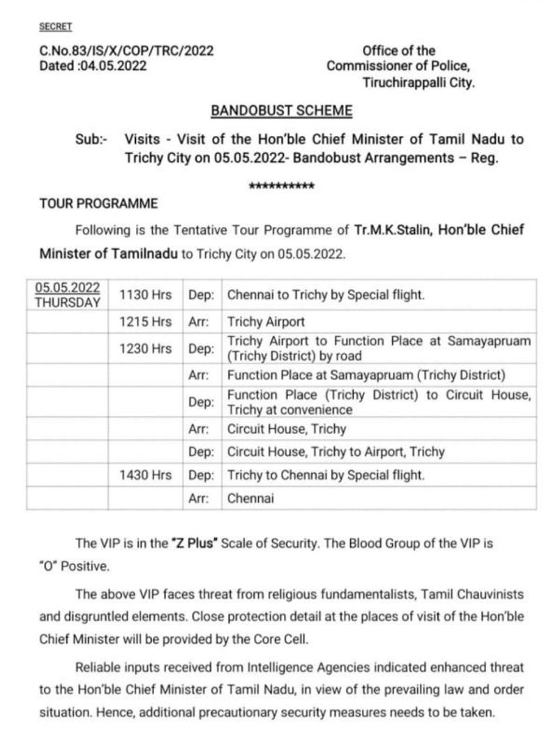 திருச்சி வரும் முதல்வர் ஸ்டாலினுக்கு மதவாதிகளால் ஆபத்து இருப்பதாக உளவுத்துறை கொடுத்தத தகவலின் அடிப்படையில் அவருக்கு பாதுகாப்பு பலப்படுத்தப்பட்டுள்ளது.