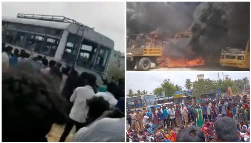 பள்ளி முன்பு நின்றிருந்த போலீஸ்காரர்களை தள்ளிவிட்டு பள்ளிக்குள் நுழைந்து வளாகத்தில் நிறுத்தியிருந்த பள்ளி பேருந்துகள், கார், டிராக்டர், பொக்லைன் இயந்திரம் உள்ளிட்டவைகளை தீவைத்து எரித்தனர். இதனால், பதற்றம் நிலவியதை அடுத்த 144 தடை உதத்தரவு பிறப்பிக்கப்பட்டு கலவரம் கட்டுக்குள் கொண்டு வரப்பட்டது. இதில், 50க்கும் மேற்பட்ட போலீசார் காயங்களுடன் மருத்துவமனையில் அனுமதிக்கப்பட்டு சிகிச்சை பெற்று வருகின்றனர்.