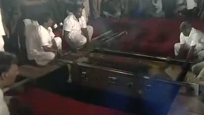 இதனையடுத்து அங்கு பிரதமர் மோடி, ராகுல்காந்தி உள்ளிட்ட அரசியல் கட்சி தலைவர்கள், திரையுலகினர் மற்றும் லட்சக்கணக்கான தொண்டர்கள் அஞ்சலி செலுத்தினர். பிறகு ஊர்வலமாக எடுத்து செல்லப்பட்டு 21 குண்டுகள் முழங்க சென்னை மெரினாவில் உள்ள அண்ணா சமாதி பக்கத்தில் அவரதுஉடல் நல்லடக்கம் செய்யப்பட்டுள்ளது.