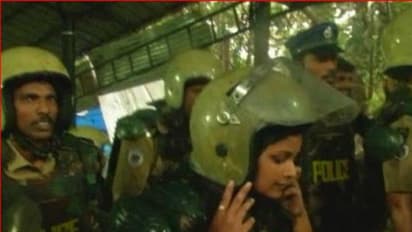 அந்த பெண்கள் ஹெல்மெட் அணிந்து சென்றனர். அவர்களைச் சுற்றி நூற்றுக் கணக்கான போலீசார் அரணாக நின்று பாதுகாப்பு கொடுத்தனர். ஆனால் அய்யப்ப பக்தர்கள் அவர்களை உள்ளே நுழைய விடாமல் தடுத்து நிறுத்தினர். இதனால் அங்கு பதற்றம் நிலவியது. இதைத் தொடர்ந்து போலீசார் போராட்டங்கார்களுடன் பேச்சு வார்வ்ர்த்தை நடத்தினர். ஆனால் அவர்களை உள்ளே விடக் கூடாது என பக்தர்கள் உறுதியான இருந்தனர்.