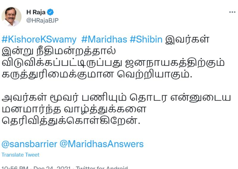 இந்த மூன்று பேரும், வெவ்வேறு காலை இடைவெளியில் கைது செய்யப்பட்டிருந்தாலும், வலதுசாரி சிந்தனை கொண்ட மற்றும் பாஜக ஆதரவாளர்களான மாரிதாஸ், கிஷோர் கே சாமி மற்றும் சிபின் ஆகியோர் ஒரே நாளில் விடுதலை செய்யப்பட்டிருப்பது குறிப்பிடத்தக்கது. இதுகுறித்து ட்விட்டரில் பாஜக எச்.ராஜா கருத்து தெரிவித்து இருந்தார் என்பது குறிப்பிடத்தக்கது.