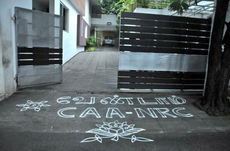 இதனிடையே சென்னை ஆழ்வார்ப்பேட்டையில் உள்ள ஸ்டாலின், கோபாலபுரத்தில் உள்ள கருணாநிதி வீடு, சி.ஐ.டி., காலனியில் உள்ள கனிமொழி வீட்டில்கோலம் போடப்பட்டுள்ளது. வேண்டாம் CAA, NRC என்றும், அருகில் சில பூக்களும் கோலத்தில் இடம் பெற்றிருந்தது.