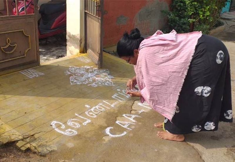 அதே நேரத்தில் தமிழகம் முழுவதும் குடியுரிமை திருத்தச் சட்டத்திற்கு எதிர்ப்பு தெரிவித்து தமிழகம் முழுவதும் இன்று பல்லாயிரக்கணக்கானோர் கோலமிட்டனர். இதே போல் குடியுரிமை சட்டத்திற்கு ஆதரவு தெரிவித்தும் கோலங்கள் போடப்பட்டன.