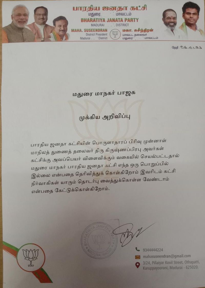 இதுதொடர்பாக மதுரை மாநகர் பாஜக மாவட்ட தலைவர் மகா சுசீந்திரன் வெளியிட்டுள்ள அறிவிப்பில்;- பாரதிய ஜனதா கட்சியின் பொருளாதாரப் பிரிவு முன்னாள் மாநிலத் துணைத் தலைவர் கிருஷ்ணப்பிரபு அவர்கள் கட்சிக்கு அவப்பெயர் விளைவிக்கும் வகையில் செயல்பட்டதால் மதுரை மாநகர் பாரதிய ஜனதா கட்சி எந்த ஒரு பொறுப்பில் இல்லை என்பதை தெரிவித்துக் கொள்கிறோம். இவரிடம் கட்சி நிர்வாகிகள் யாரும் தொடர்பு வைத்துக்கொள்ள வேண்டாம் என்பதை கேட்டுக்கொள்கிறோம் என மகா சுசீந்திரன் தெரிவித்துள்ளார்.