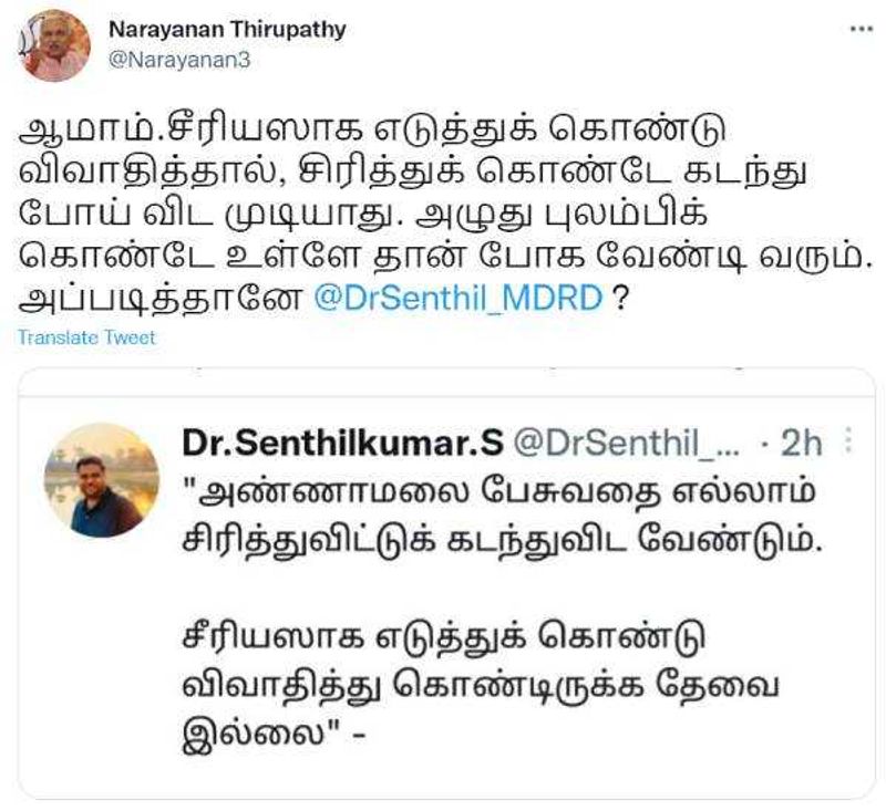 மேலூர் அண்ணாமலை பேசுவதை எல்லாம் சிரித்துவிட்டு கடந்துவிட வேண்டும், சீரியஸாக எடுத்துக் கொண்டு விவாதித்துக் கொண்டிருக்க தேவையில்லை என தனது ட்விட்டர் பக்கத்தில் பதிவிட்டு இருந்தார், இதற்கு பதிலடி கொடுத்து பாஜக மாநிலத் துணைத் தலைவர் நாராயணன் திருப்பதி சீரியசாக எடுத்துக்கொண்டு விவாதித்தால் சிரித்துக்கொண்டே கடந்து போய்விட முடியாது, அழுது புலம்பிக் கொண்டே உள்ளே தான் போக வேண்டி வரும் எனக் கூறியிருந்தார்.