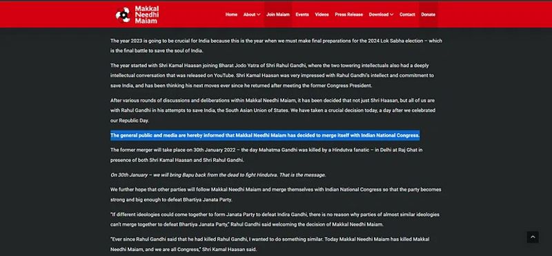 இந்நிலையில், நேற்று மாலை மக்கள் நீதி மய்யம் கட்சியை காங்கிரஸ் கட்சியுடன் அதிகாரப்பூர்வமாக இணையதளத்தில் வரும் 30ம் தேதி ராகுல் காந்தி தலைமையில் காங்கிரஸ் கட்சியுடன் கமல்ஹாசனின் மக்கள் நீதி மய்யம் கட்சி இணைய உள்ளதாக தகவல்கள் வெளியானது. இதில், அரசியல் அரங்கில் பெரும் பரபரப்பை ஏற்படுத்தியது. இதைத்தொடர்ந்து இந்த செய்தி குறித்து சில ஊடங்களிலும், சமூக வலைதளங்களில் செய்தி வெளியானது.