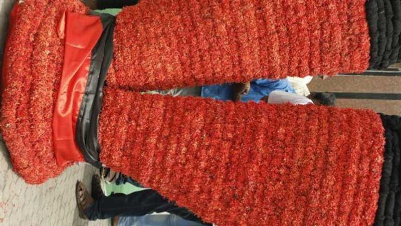 திருச்சியில் தி.மு.க. அலுவலகமான கலைஞர் அறிவாலயத்தில், ஆசிரியர்களுக்கு விருது வழங்கும் விழா நேற்று நடைபெற்றது. இதில், நகர்ப்புற வளர்ச்சி துறை அமைச்சர் நேரு சிறப்பு அழைப்பாளராக பங்கேற்றார். நிகழ்ச்சியை நடத்தியவர்கள், நேருவை வரவேற்க 1 லட்சம் ரூபாய் செலவில், 500 கிலோ பூக்கள் மற்றும் கயிறு மூலம் கருப்பு, சிவப்பில் மெகா சைஸ் மாலை தயாரித்தனர். அதை ஆட்களால் தூக்க முடியாது என்பதால், கிரேன் மூலம் மாலையை தூக்கி நிறுத்தி இருந்தனர்.