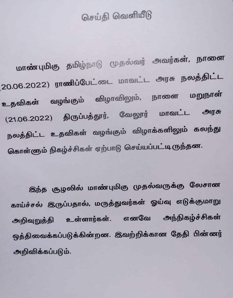 இதுக்குறித்து வெளியிட்டுள்ள செய்திக்குறிப்பில்,” நாளை நடக்கவிருக்கும் ராணிப்பேட்டை மாவட்ட அரசு நலத்திட்ட உதவிகள் வழங்கும் விழாவிலும் நாளை மறுநாள் திருப்பத்தூர், வேலூர் மாவட்ட அரசு நலத்திட்ட உதவிகள் வழங்கும் விழாவிலும் முதலமைச்சர் மு.க.ஸ்டாலின் கலந்துக்கொள்ளும் நிகழ்ச்சிகள் ஏற்பாடு செய்யப்பட்டிருந்தன.