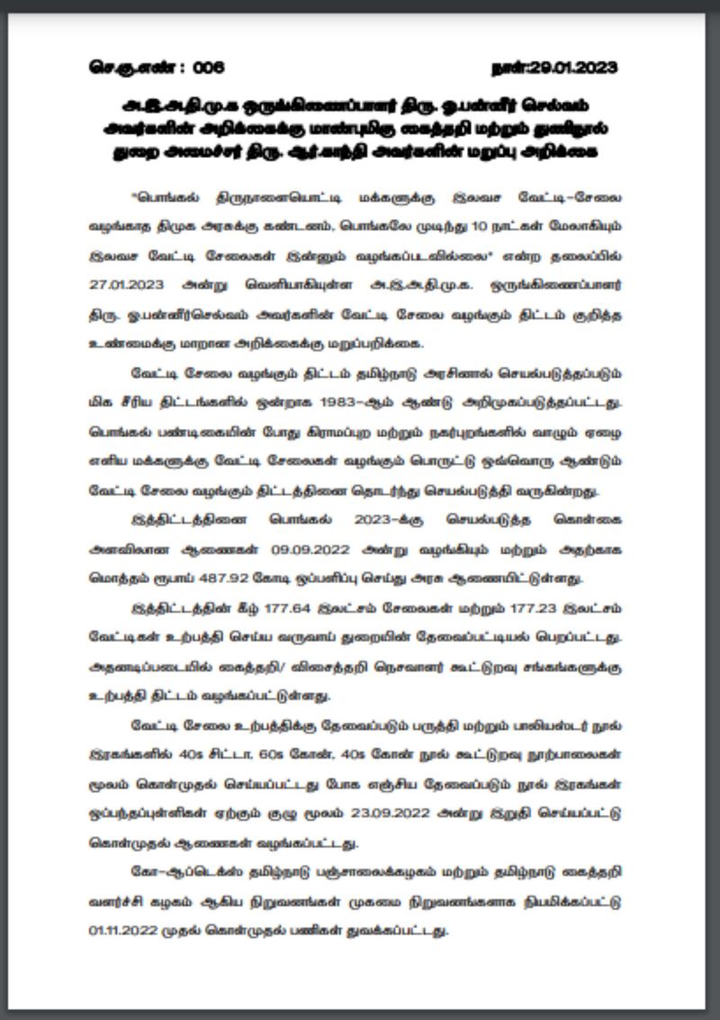 இதுகுறித்து வெளியிட்டுள்ள அறிக்கையில், பொங்கல் திருநாளையொட்டி மக்களுக்கு இலவச வேட்டி-சேலை வழங்காத திமுக அரசுக்கு கண்டனம், பொங்கலே முடிந்து 10 நாட்கள் மேலாகியும் இலவச வேட்டி சேலைகள் இன்னும் வழங்கப்படவில்லை“ என்ற தலைப்பில் 27.01.2023 அன்று வெளியாகியுள்ள அ.இ.அ.தி.மு.க. ஒருங்கிணைப்பாளர் ஓ.பன்னீர்செல்வம் அவர்களின் வேட்டி சேலை வழங்கும் திட்டம் குறித்த உண்மைக்கு மாறான அறிக்கைக்கு மறுப்பறிக்கை.