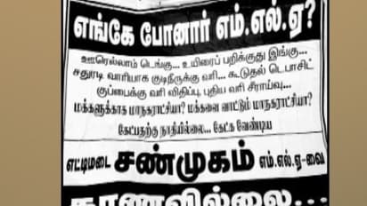 அந்த போஸ்டரில், எங்கே போனார் எம்.எல்.ஏ.? ஊரெல்லாம் டெங்கு... உயிரை பறிக்குது... சதுரடி வாரியாக குடிநீருக்கு வரி... கூடுதல் டெபாசிட்... குப்பைக்கு வரி விதிப்பு... புதிய வரி சீராய்வு... மக்களுக்காக மாநகராட்சியா? மக்களை வாட்டும் மாநகராட்சியா...? கேட்பதற்கு நாதியில்லை... கேட்க வேண்டிய தொகுதி எம்.எல்.ஏ. எட்டிமடை சண்முகத்தை காணவில்லை... எம்.எல்.ஏ.வை தேடி கண்டுபிடித்து கொடுத்தால் தக்க சன்மானம் வழங்கப்படும் - இப்படிக்கு, கிணத்துக்கடவு தொகுதி மக்கள், என குறிப்பிடப்பட்டுள்ளது.