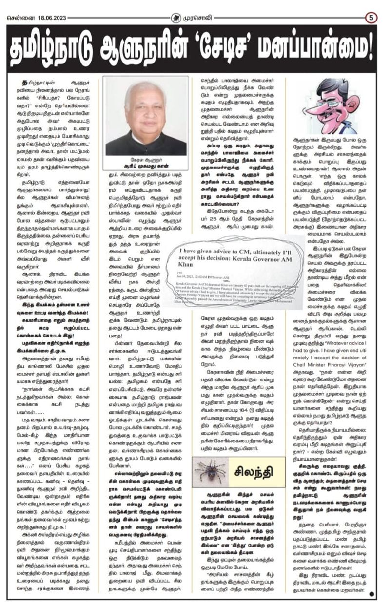 சிலருக்கு எதையாவது குத்தி, குதறிக் கொண்டே இருப்பதில் ஒரு வித ஆனந்தம்; அதனைத்தான் சேடிசம் என்று கூறுவார்கள்! நமது தமிழ்நாட்டு ஆளுநரின் நடவடிக்கைகளைக் காணும்போது இதுதான் நம் நினைவுக்கு வருகிறது. தந்தை பெரியார். பேரறிஞர் அண்ணா, முத்தமிழ் அறிஞரால் பதப்படுத்தப்பட்ட மண் தமிழ் நாட்டு மண்! இங்கே சனாதனம், வர்ணாசிரமம் எனும் விஷச் செடிகளை வளர்க்க எண்ணி விஷமத் தனங்களில் ஈடுபடாதீர்கள்! இது திராவிட மண் நடப்பது திராவிட மாடல் ஆட்சி! இதை நடத்துபவர்கள் கொள்கை மறவர்கள் என முரசோலி தனது கட்டுரையில் காட்டமாக தெரிவித்துள்ளது.