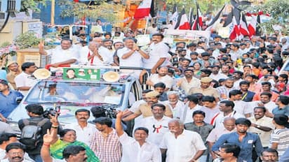 கன்னியகா பரமேஸ்வரி கோவிலில் சாமி கும்பிட்டார். இதனைத் தொடர்ந்து திறந்த ஜீப்பில் நின்று பிரச்சாரம் செய்த அவர்,