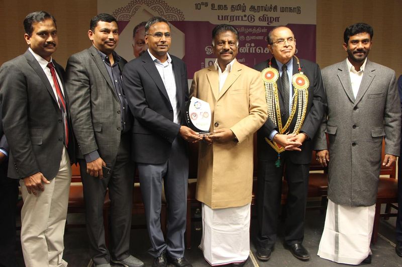 நேற்று அமெரிக்கா தமிழ் சங்கம் சார்பாக நடைபெற்ற குழந்தைகள் தின விழாவில் அவர் கலந்து கொண்டார். இந்த நிலையில்சிகாகோ ஓக் புரூக் டெரேஸில், 10வது உலக தமிழ் ஆராய்ச்சி மாநாடு சிறப்பாக முடிந்தமைக்கான பாராட்டு விழாவில் சிகாகோ உலக தமிழ் சங்கம் சார்பாக துணைமுதல்வர் பன்னீர் செல்வத்திற்கு 'தங்க தமிழ் மகன்' விருது வழங்கப்பட்டது.