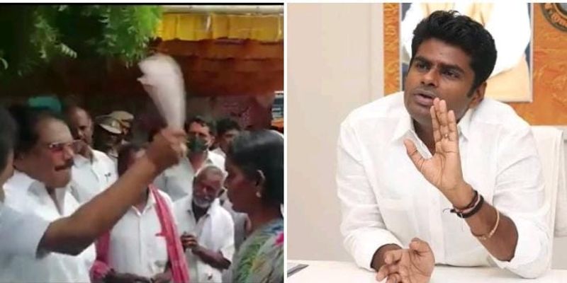 பாஜகவின் மாநில தலைவர் அண்ணாமலை தி.நகரில் உள்ள பாஜக தலைமை அலுவலகமான கமலாலயத்தில் செய்தியாளர்களுக்கு பேட்டியளிக்கையில்;- விருதுநகரில் மனு கொடுக்க வந்த ஏழை தாயை, வருவாய் துறை அமைச்சர் ராமச்சந்திரன், அவர் அளித்த மனுவை வைத்தே தலையில் ஓங்கி அடித்துள்ளார். இந்த வீடியோவை பாஜக வெளியிட்ட பின் அமைச்சரின் ஆட்கள் அந்த பெண்ணைச் சமாதனப் படுத்தி உள்ளனர். அமைச்சர் பதவியை ராஜினாமா செய்ய வலியுறுத்தி அவர் வீட்டை முற்றுகையிட்டு போராட்டம் நடத்துவோம்.