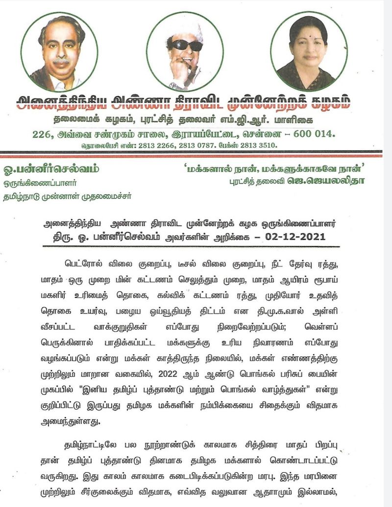 சென்னை: ஏராளமான வாக்குறுதிகளை மக்களுக்கு அளித்துவிட்டு இப்போது தமிழ் புத்தாண்டை மாற்றும் நடவடிக்கையை உடனடியாக கைவிட வேண்டும் என்று திமுக அரசுக்கு அதிமுக ஒருங்கிணைப்பாளர் ஓ. பன்னீர்செல்வம் தெரிவித்துள்ளார்.