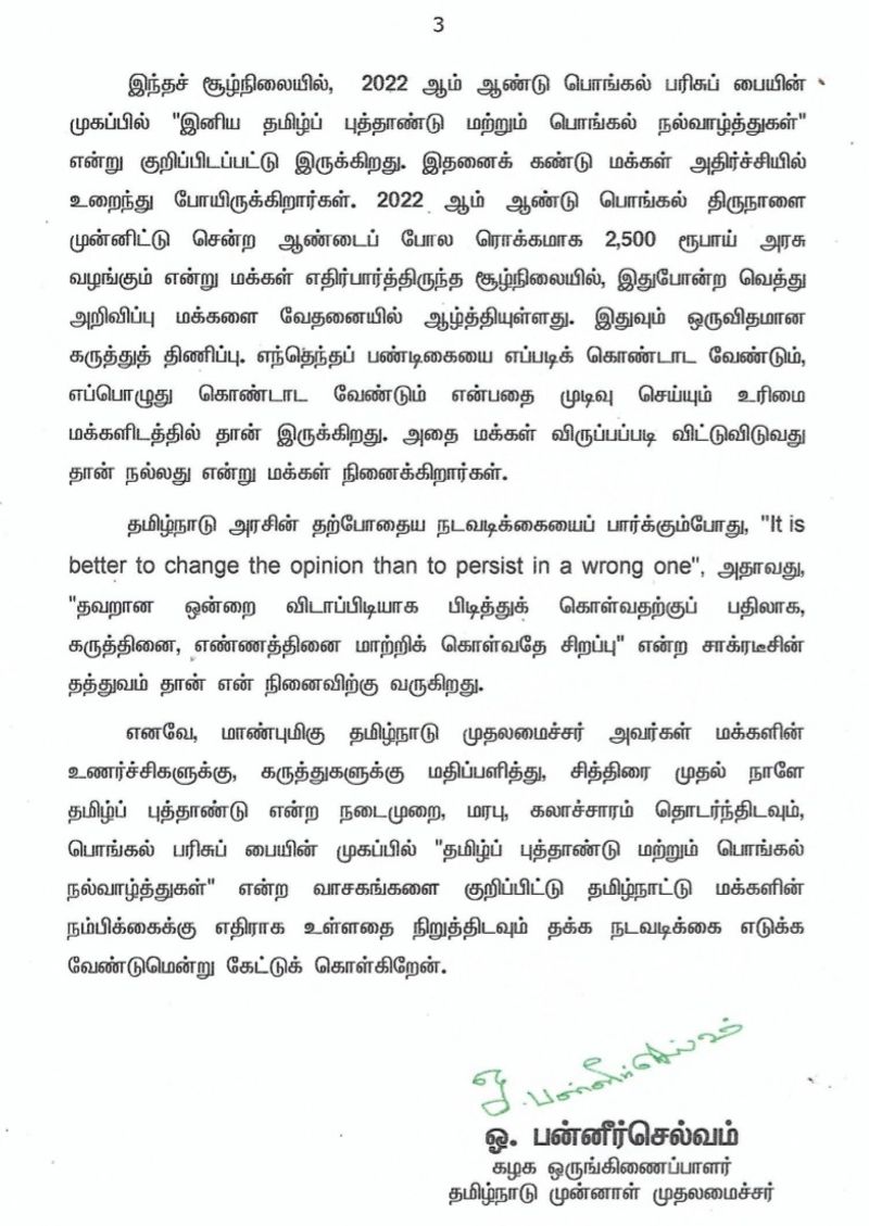 எனவே, மக்களின் உணர்ச்சிகளுக்கு, கருத்துகளுக்கு முதல்வர் மதிப்பளித்து, சித்திரை முதல் நாளே தமிழ்ப் புத்தாண்டு என்ற நடைமுறை, மரபு, கலாச்சாரம் தொடர்ந்திடவும், பொங்கல் பரிசு பை முகப்பில் தமிழ்ப் புத்தாண்டு மற்றும் பொங்கல் நல்வாழ்த்துகள் என்ற வாசகங்களை குறிப்பிட்டு தமிழக மக்களின் நம்பிக்கைக்கு எதிராக உள்ளதை நிறுத்திடவும் தக்க நடவடிக்கை எடுக்க வேண்டும் என்று கேட்டுக் கொள்கிறேன் என்று ஓ.பன்னீர்செல்வம் தெரிவித்துள்ளார்.
