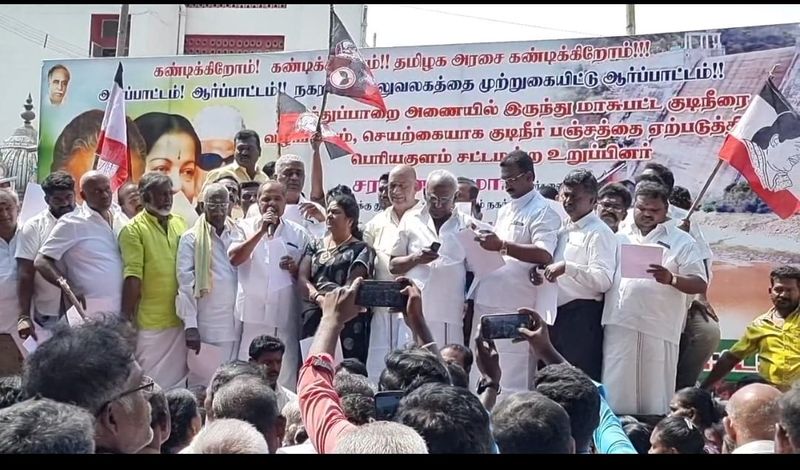 அதிமுகவில் ஒற்றை தலைமை மோதல் காரணமாக ஓபிஎஸ்- இபிஎஸ் அணிகளுக்கு இடையே மோதல் ஏற்பட்டுள்ளது. இதனையடுத்து ஓபிஎஸ்யை கழட்டிவிட்ட இபிஎஸ் அதிமுகவை கைப்பற்றியுள்ளார். இதனையடுத்து ஓபிஎஸ்- டிடிவி தினகரன்- சசிகலா ஆகிய மூன்று பேரும் ஒன்றினைவார்கள் என கூறப்பட்டது. அதனை உறுதிப்படுத்தும் வகையில் தேனியில் நடைபெற்ற போராட்டத்தில் ஓபிஎஸ் அணியினர் டிடிவி தினகரன் அணியோடு இணைந்து போராட்டம் நடத்தியது பரபரப்பை ஏற்படுத்தியுள்ளது. தேனி மாவட்டத்தில் உள்ள சோத்துப்பாறை அணையில் இருந்து மாசு அடைந்த நீரை குடிநீர் வினியோகம் செய்த பெரியகுளம் நகராட்சியை கண்டித்தும், செயற்கையாக குடிநீர் பஞ்சத்தை ஏற்படுத்திய பெரியகுளம் தொகுதி திமுக சட்டமன்ற உறுப்பினர் சரவணகுமாரை கண்டித்தும், பெரியகுளம் நகராட்சி அலுவலகம் முன்பு அதிமுக மற்றும் அமமுகவினர் இணைந்து கண்டன ஆர்ப்பாட்டத்தில் ஈடுபட்டனர்.